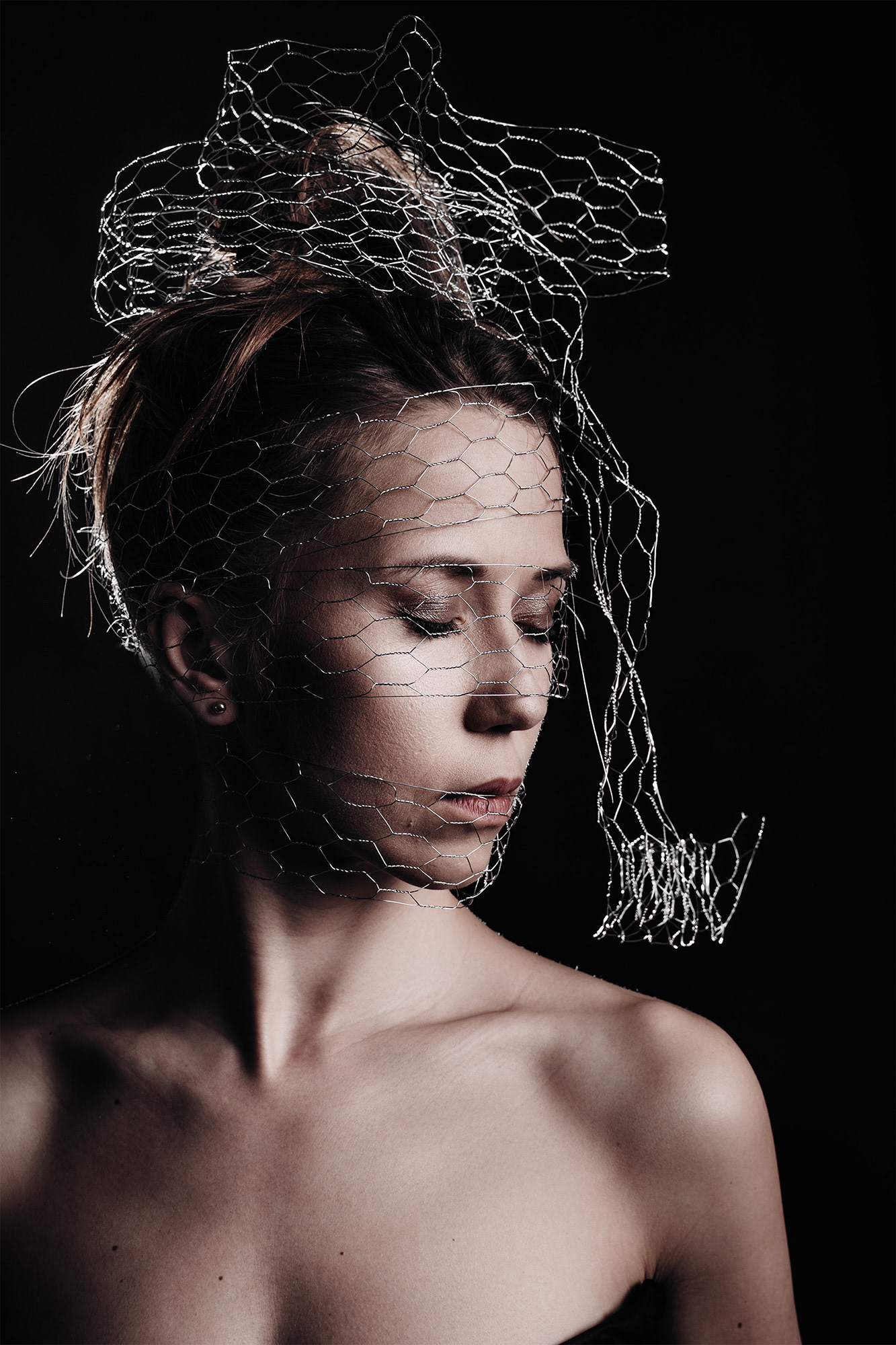 Seria „Enmeshed” to minimalistyczne, artystyczne portrety kobiety, w których motyw drucianej siatki staje się wizualną metaforą ograniczenia, wyobcowania i poszukiwania wolności.