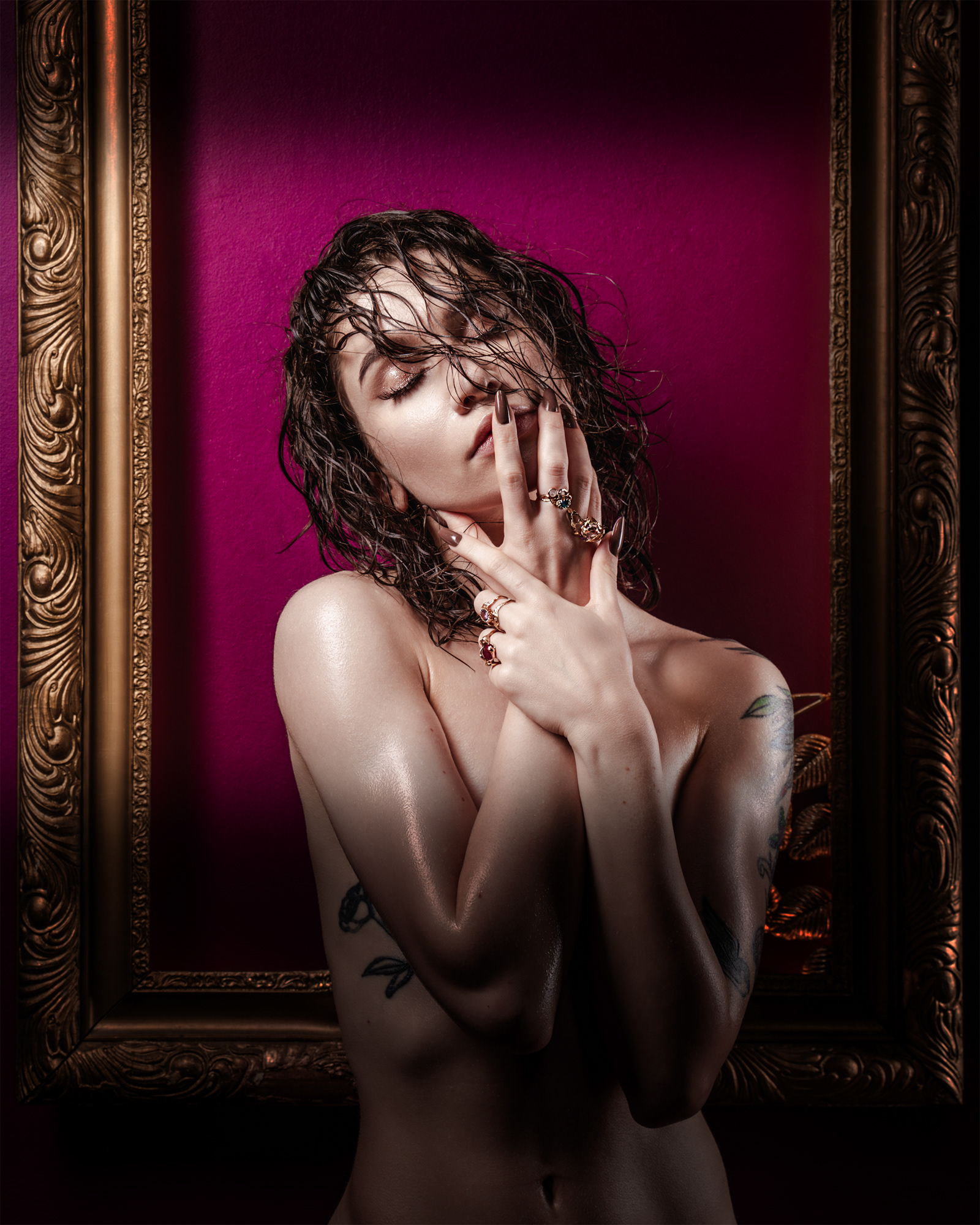 Złota rama pełni tu rolę granicy między sztuką a rzeczywistością, a ciało modelki staje się głównym obiektem ekspresji.