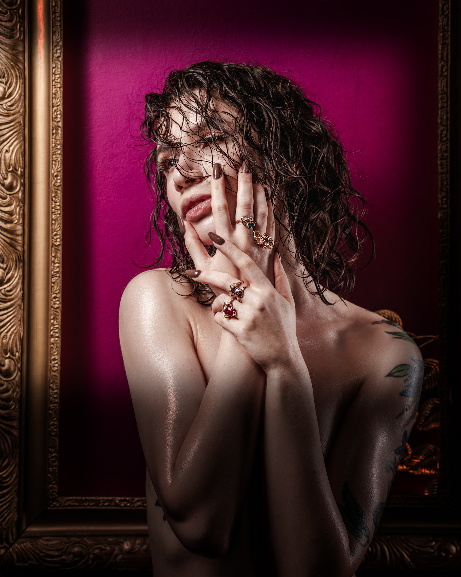 Seria „Golden Frame” to portrety kobiet stylizowanych na współczesne dzieła sztuki – eksponowanych niczym obrazy w złotej ramie na tle intensywnego, nasyconego koloru.