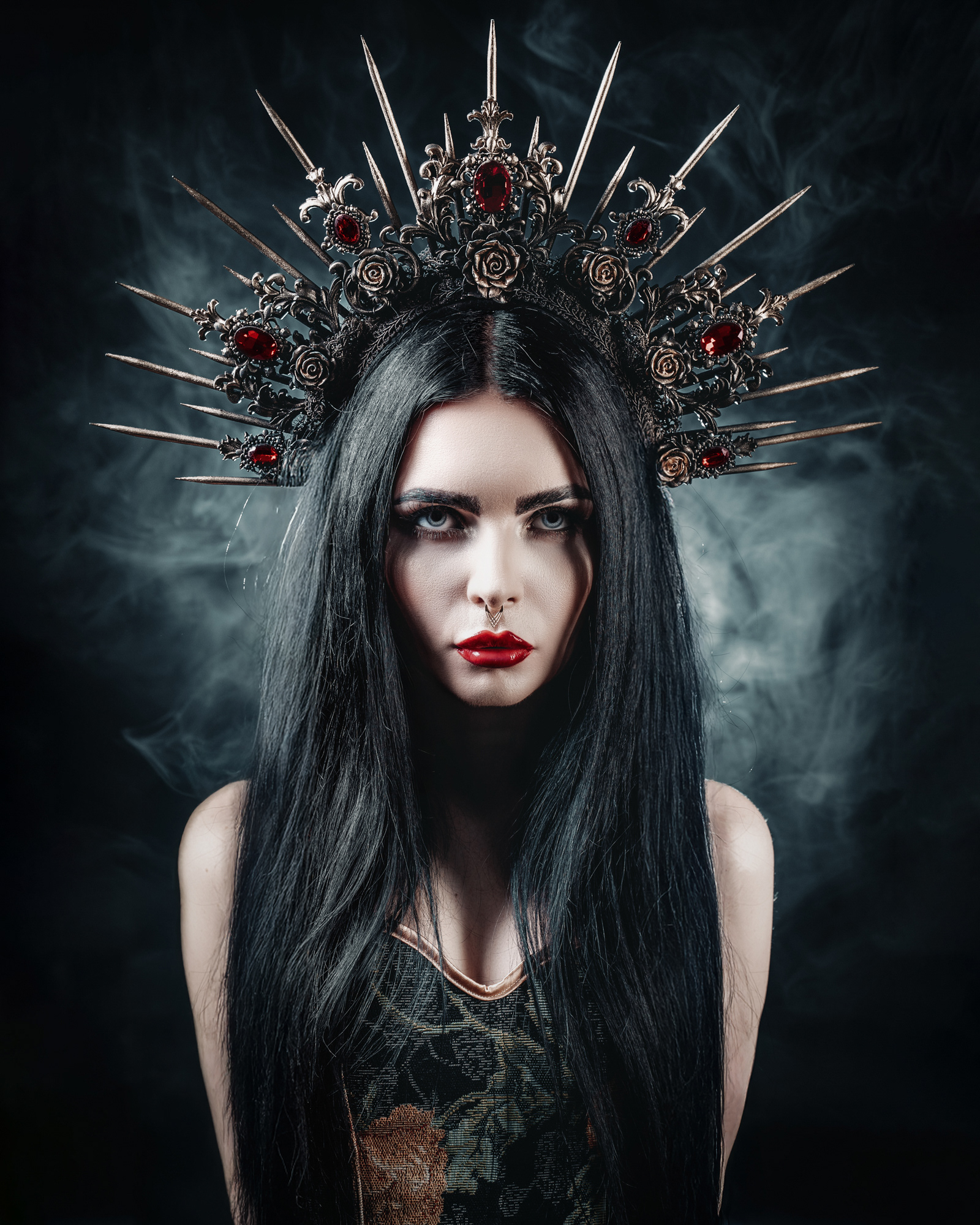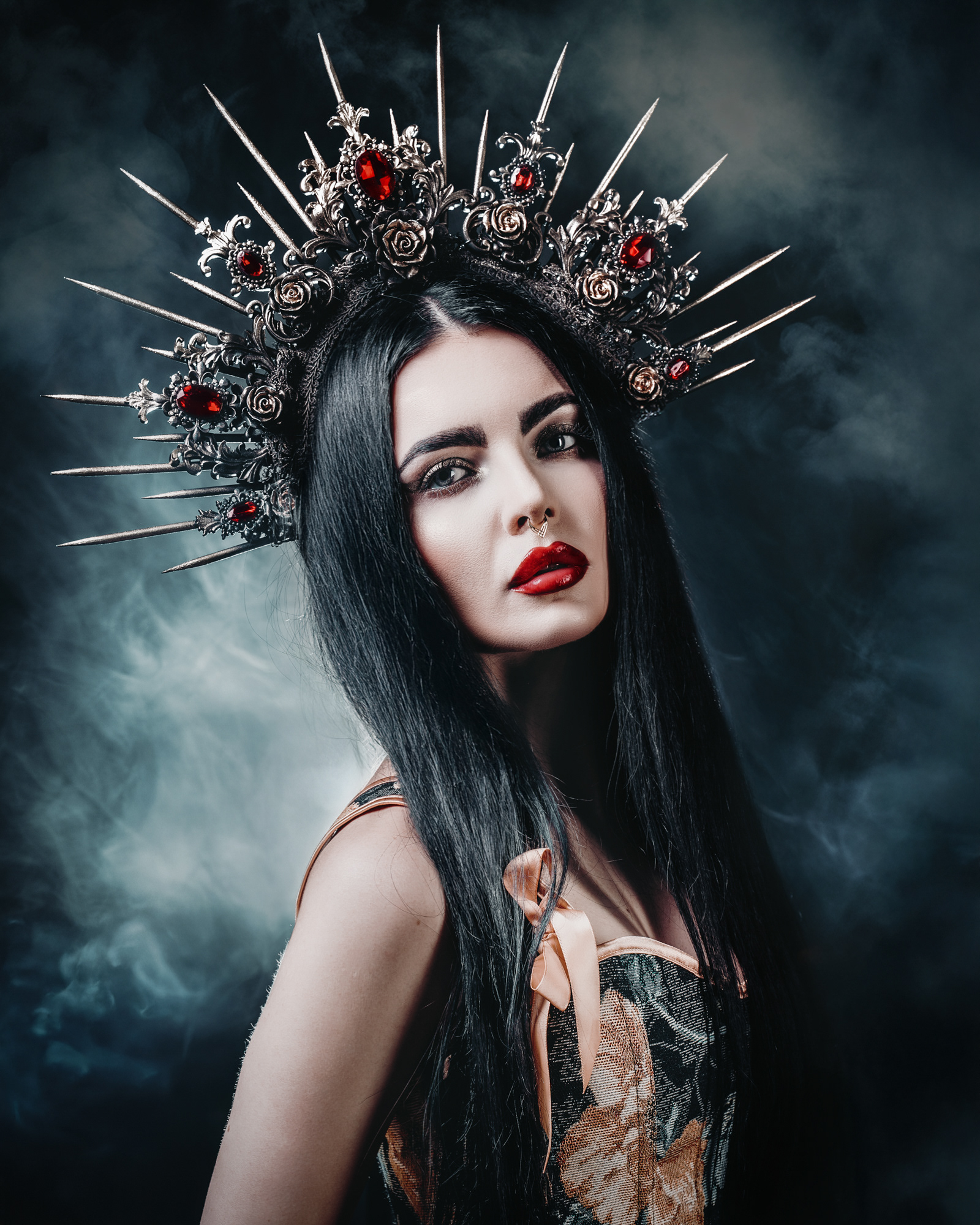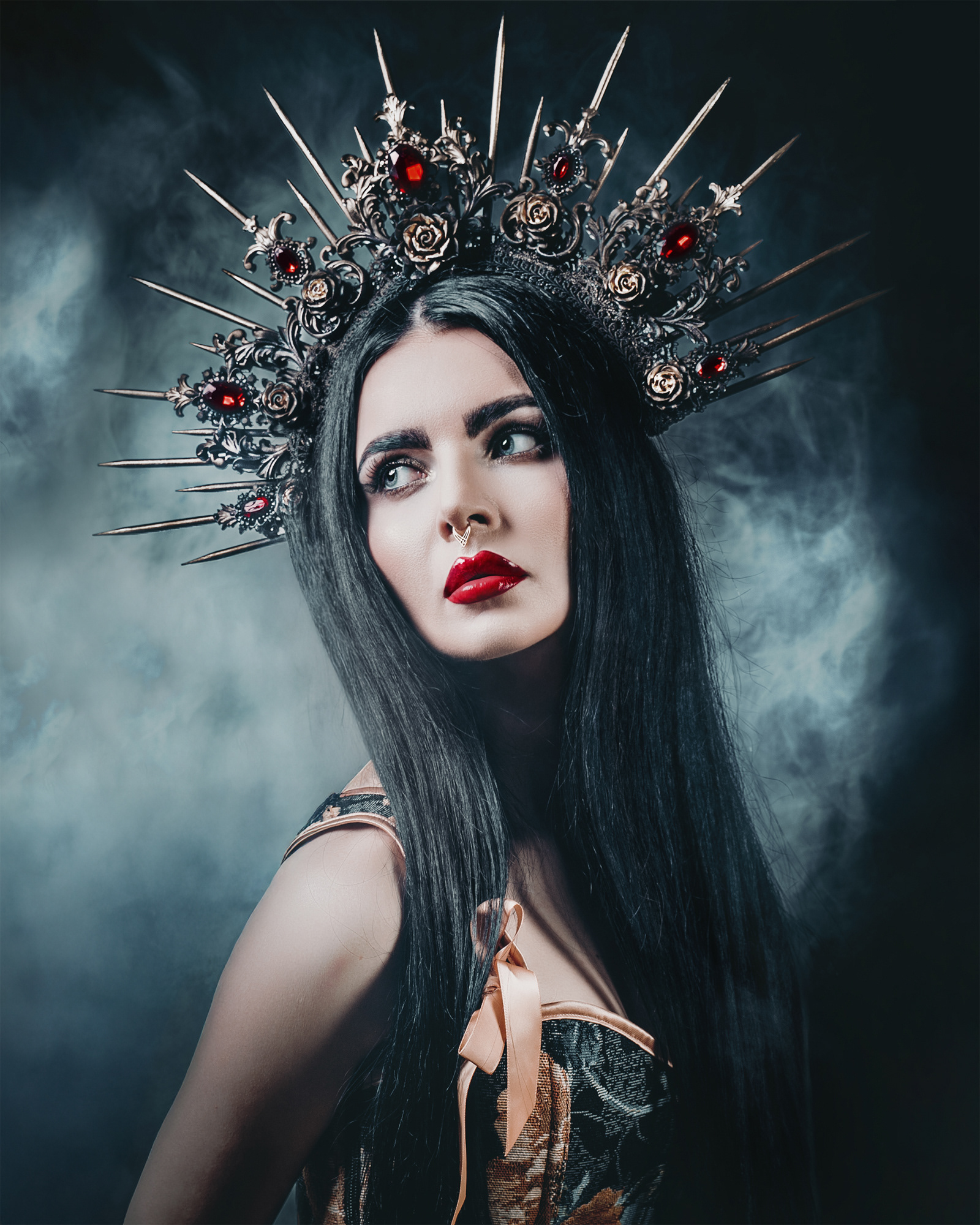 Centralnym elementem stylizacji jest bogato zdobiona korona z kolcami i czerwonymi kamieniami, podkreślająca moc, niezależność i tajemniczość kobiety.